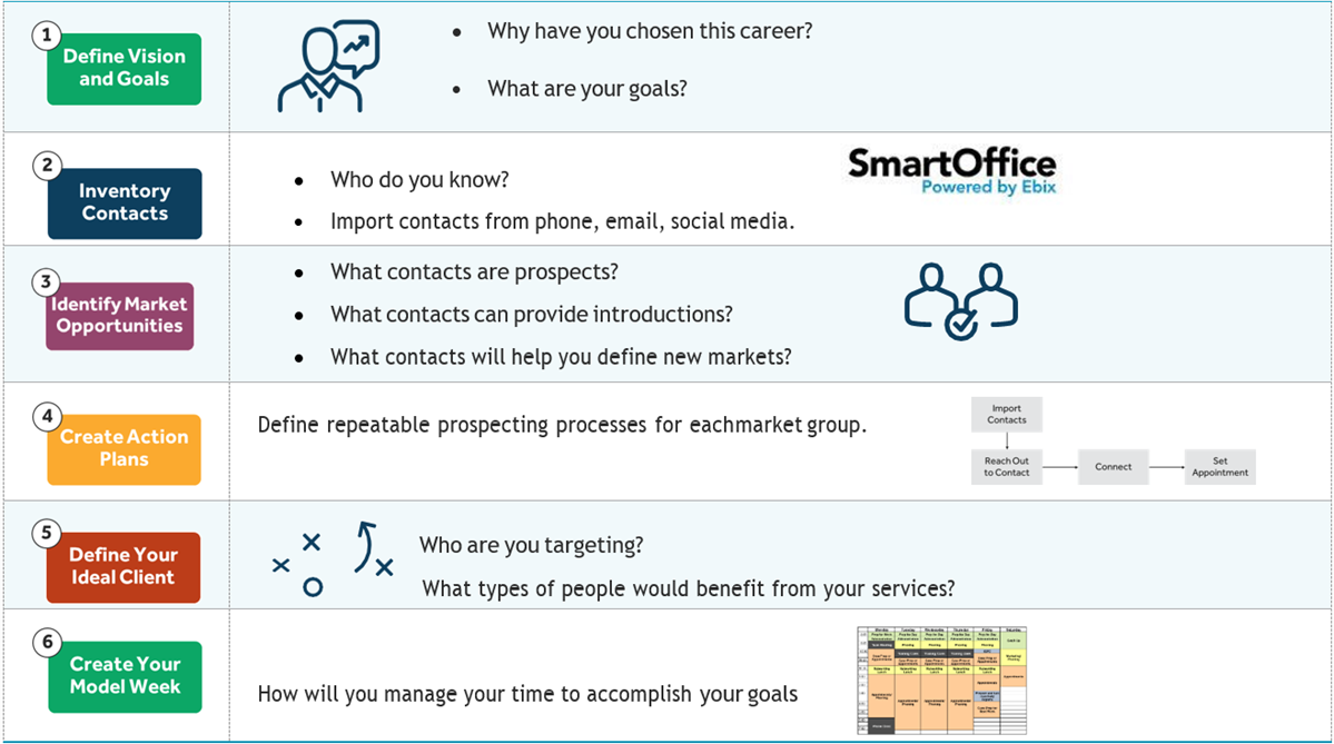 A Model Week is an ideal calendar that includes all the key activities you should complete each week to reach your business goals. Setting and following a model week ensures your calendar is focused on continuing to develop your knowledge while driving key activities that will generate revenue or result in setting new appointments. We recommend you work with your Agency Leader to set up your week initially, and then periodically review it in your one-on-one meetings. Make adjustments as necessary to focus on revenue-producing activities.