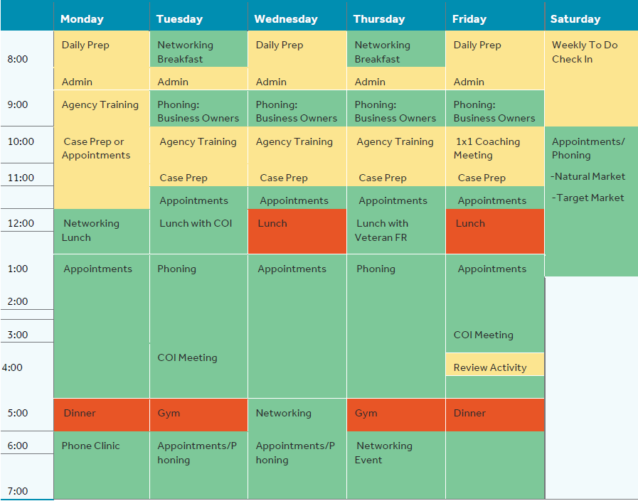 Prime business hours: these are hours during the week needed for appointment generation or sales meetings. Remember, you MUST see 6-8 new prospects each week to target making over $100,000 per year. To take into account cancellations and items you cannot control, we recommend you set your goal at 10 appointments per week. All other activities are scheduled around Green Time. As you are beginning your business, you should focus most of your time on generating leads, setting appointments and seeing prospects and clients. When you catch yourself doing a non-green activity during green time - drop whatever it is, pick up the phone and make a call.