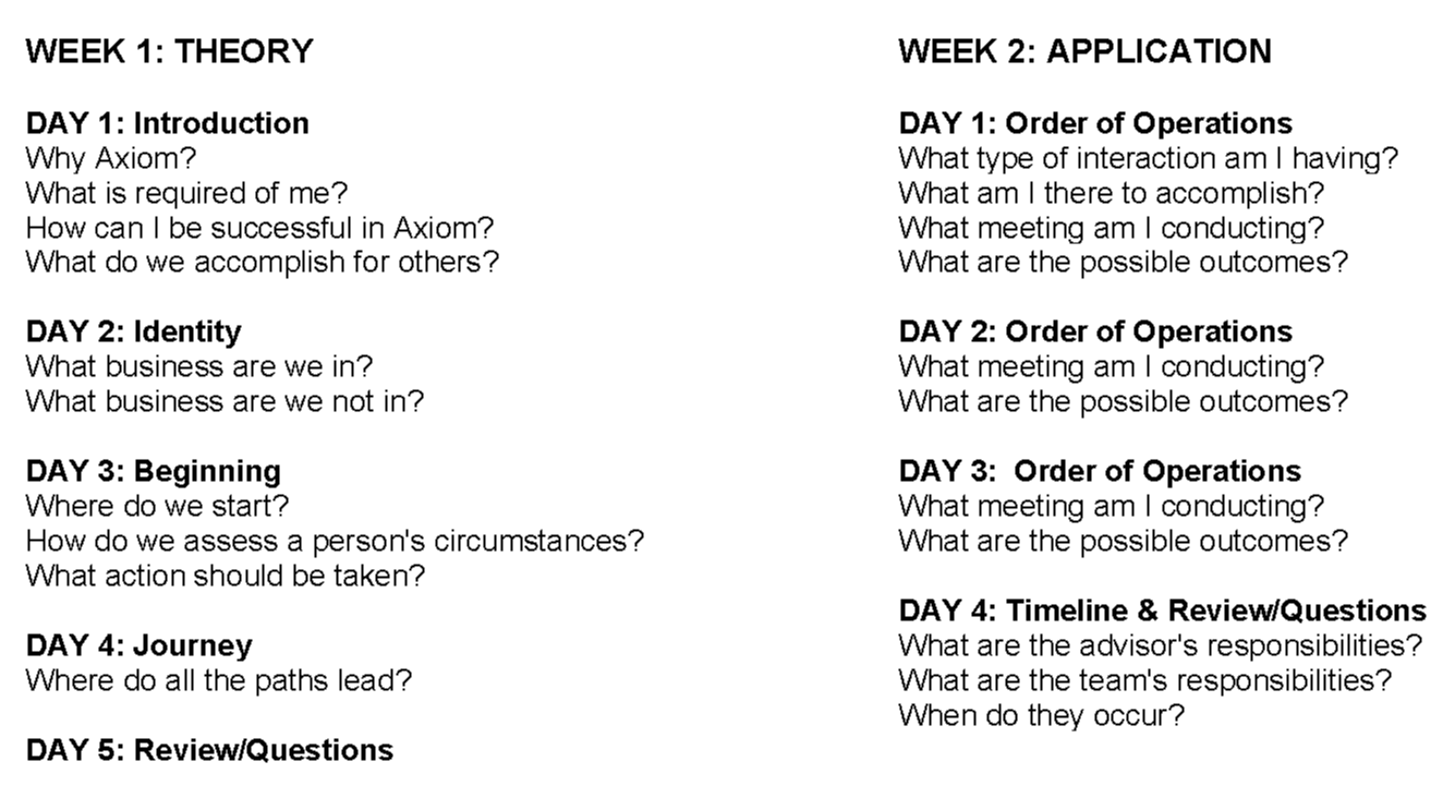 Axiom is a two-week intensive training and coaching program. New advisors to the industry will acquire a deep, philosophical foundation on which to build a successful, long-term business. Experienced advisors will gain a more grounded understanding of what produces action and the principles of a repeatable and predictable business. Both will learn what we truly accomplish for people, the theories that determine client engagement, and the tactics to produce the most powerful outcomes. Axiom can either stand alone or serve as the gateway for a fulfilling experience in ACE, the Alacrity Coaching Experience.