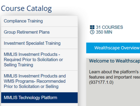 Prior to solicitation or selling of certain MMLIS products, it's recommended that you complete brief training courses. If you've yet to take the classes, click the button below, and navigate to the "MMLIS Technology Platform" tab and click the "Wealthscape Investor" dropdown to get started.
